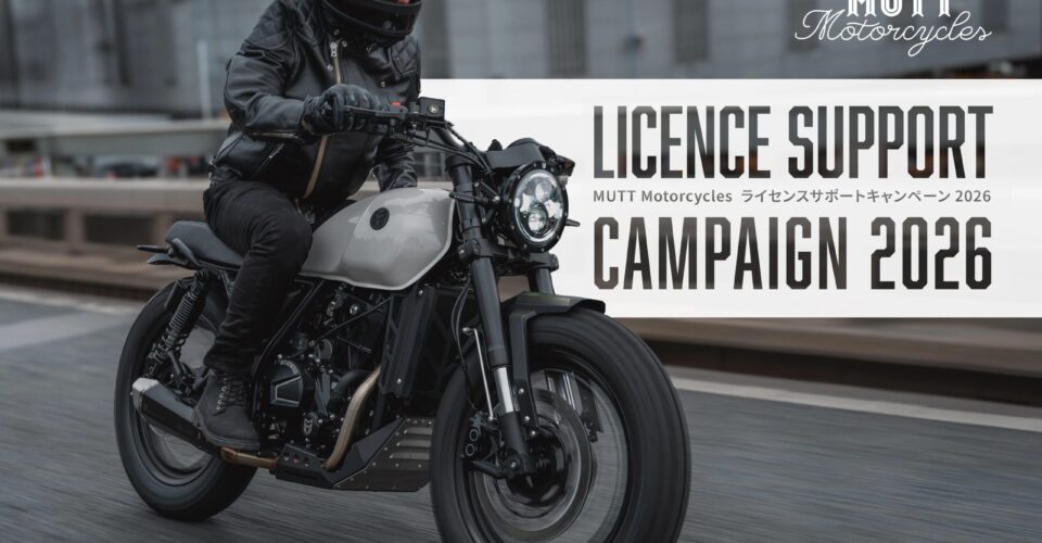 キャンペーン期間中に対象モデルの新車をご成約の上、期間内に車両新規登録をされたお客様に、アクセサリーやアパレルなどの購入費用として 110,000 円(税込)分をサポートします! MUTT Motorcycles 正規販売店で購⼊出来るアイテムであればアイテム・ブランドを問わずあなただけの MUTT LIFE を楽しむための費⽤としてご利⽤いただけます。ぜひこの機会にご利用ください!